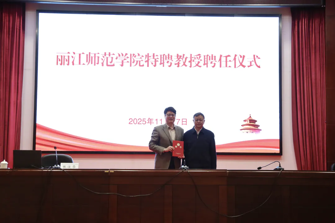 开班仪式后,毕天云代表丽江师范学院为华东师范大学张俊华颁发特聘教授聘书。